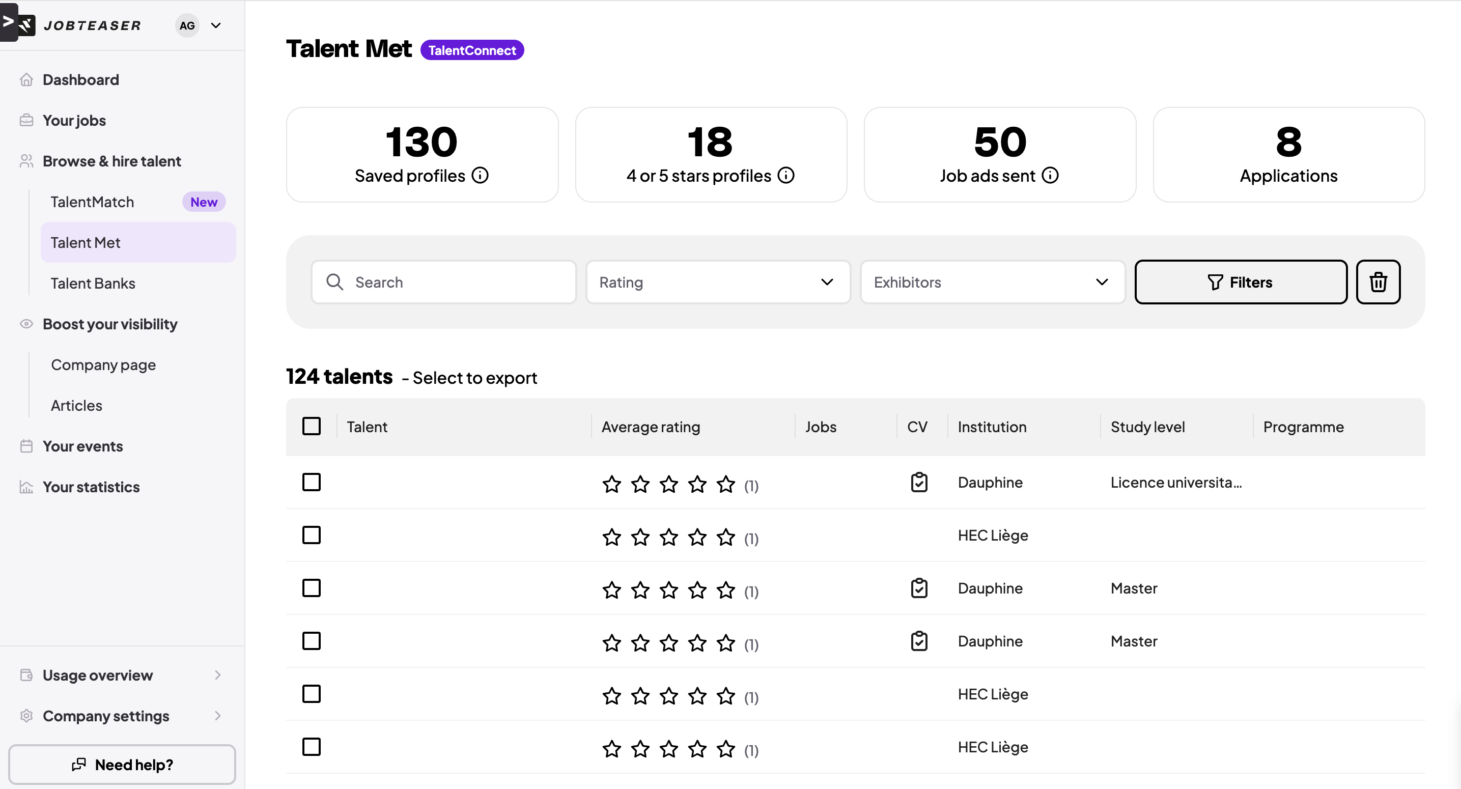 - Speichern Sie die Profile der Studierenden und Absolvent:innen, die Sie treffen, damit Sie deren Informationen später leicht wiederfinden und nachfassen können.