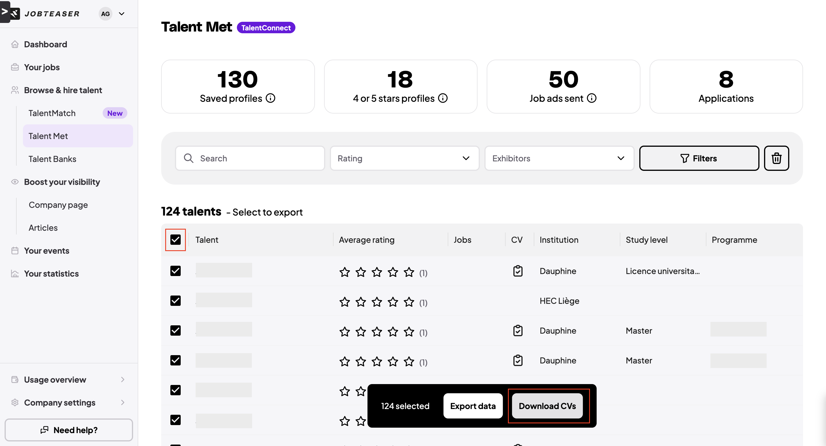 - Sie können alle hochgeladenen digitalen Lebensläufe sowie die aktuellen Profilinformationen der Talente einsehen.