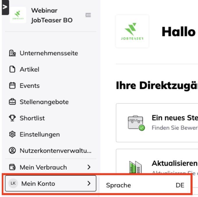 Um die Sprache Ihres Backoffices zu ändern, klicken Sie auf "Mein Konto" > "Sprache" im Seitenmenü.