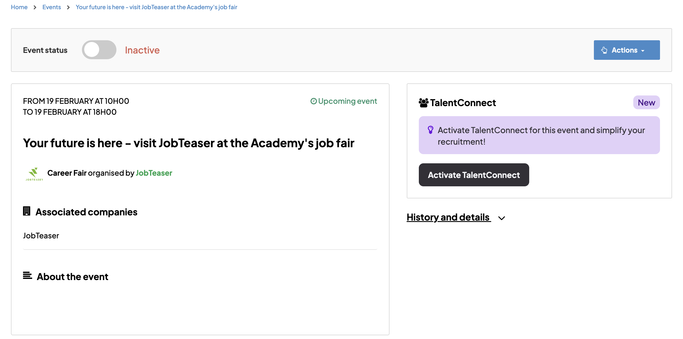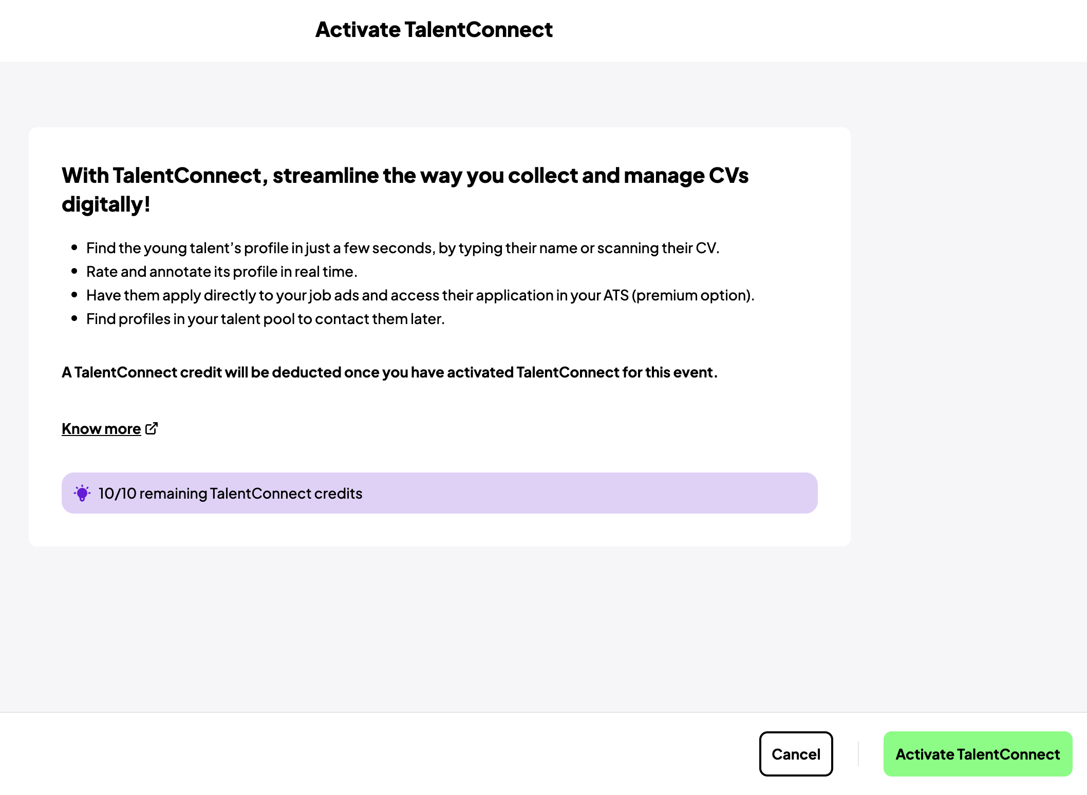 - Once your event is created, simply click on “Activate TalentConnect” on the right of your event page.