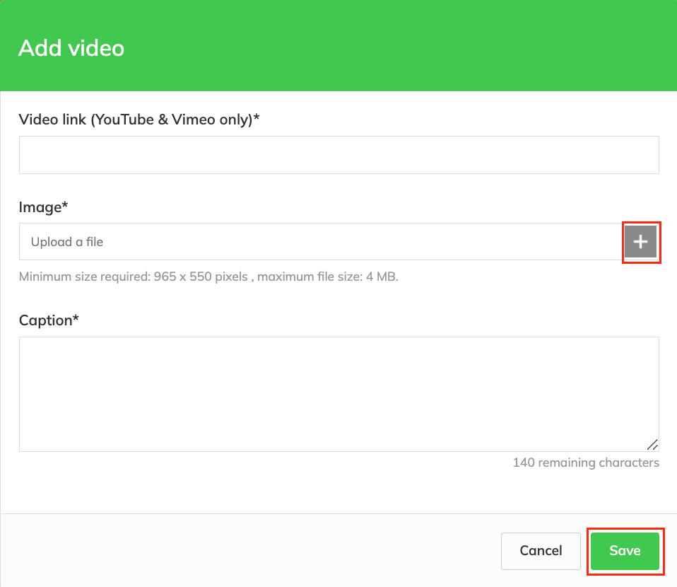 To add a video, click on Add video, paste the link from YouTube or Vimeo and upload a preview image. At the moment, this image is necessary to be able to save the video, but the actual thumbnail comes from the video player directly. Finally, add a caption in the language of your page. Done!