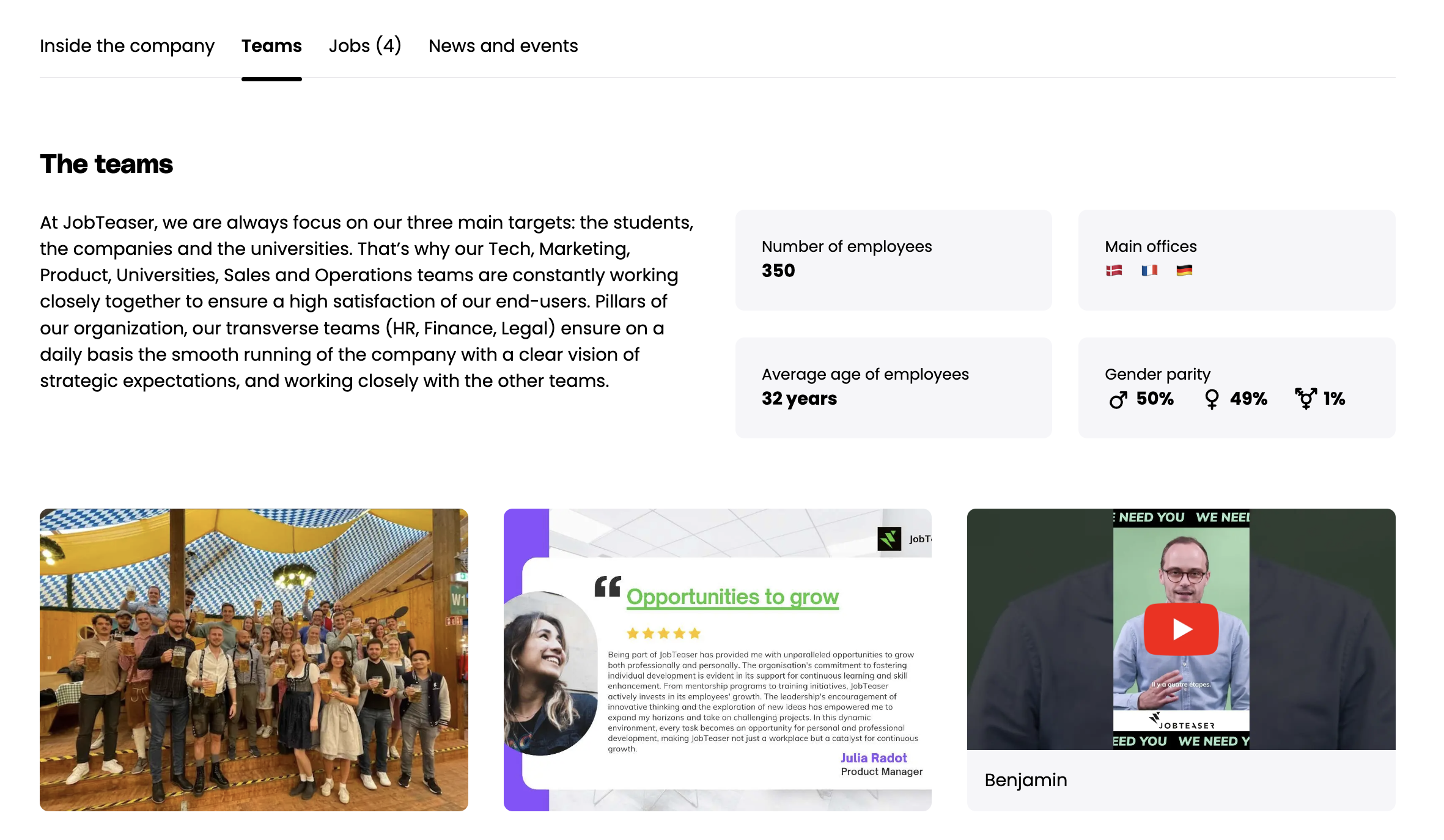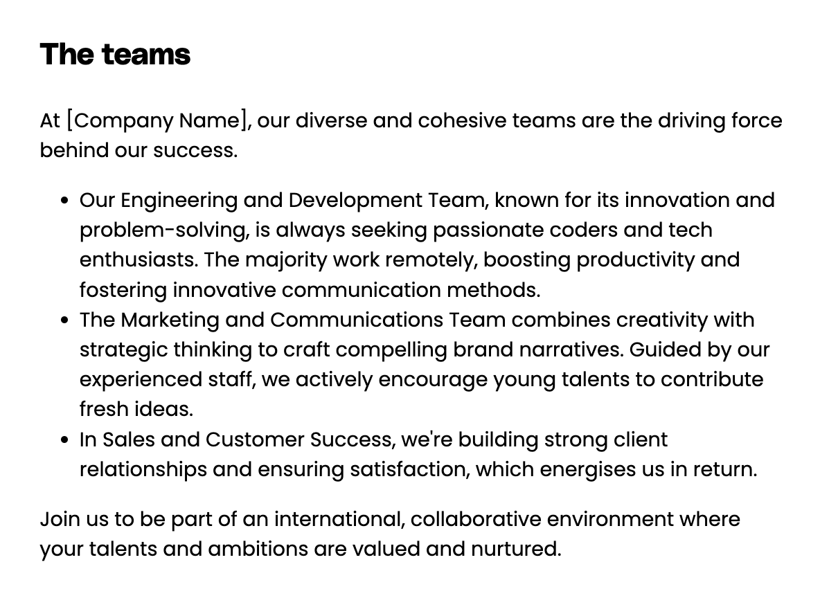- Here students can read a short description of your company's organisation, different teams & offices. You can talk about the teams you are recruiting young talents for, illustrate how your corporate values are embodied by different teams, or how international and cohesive your teams are.