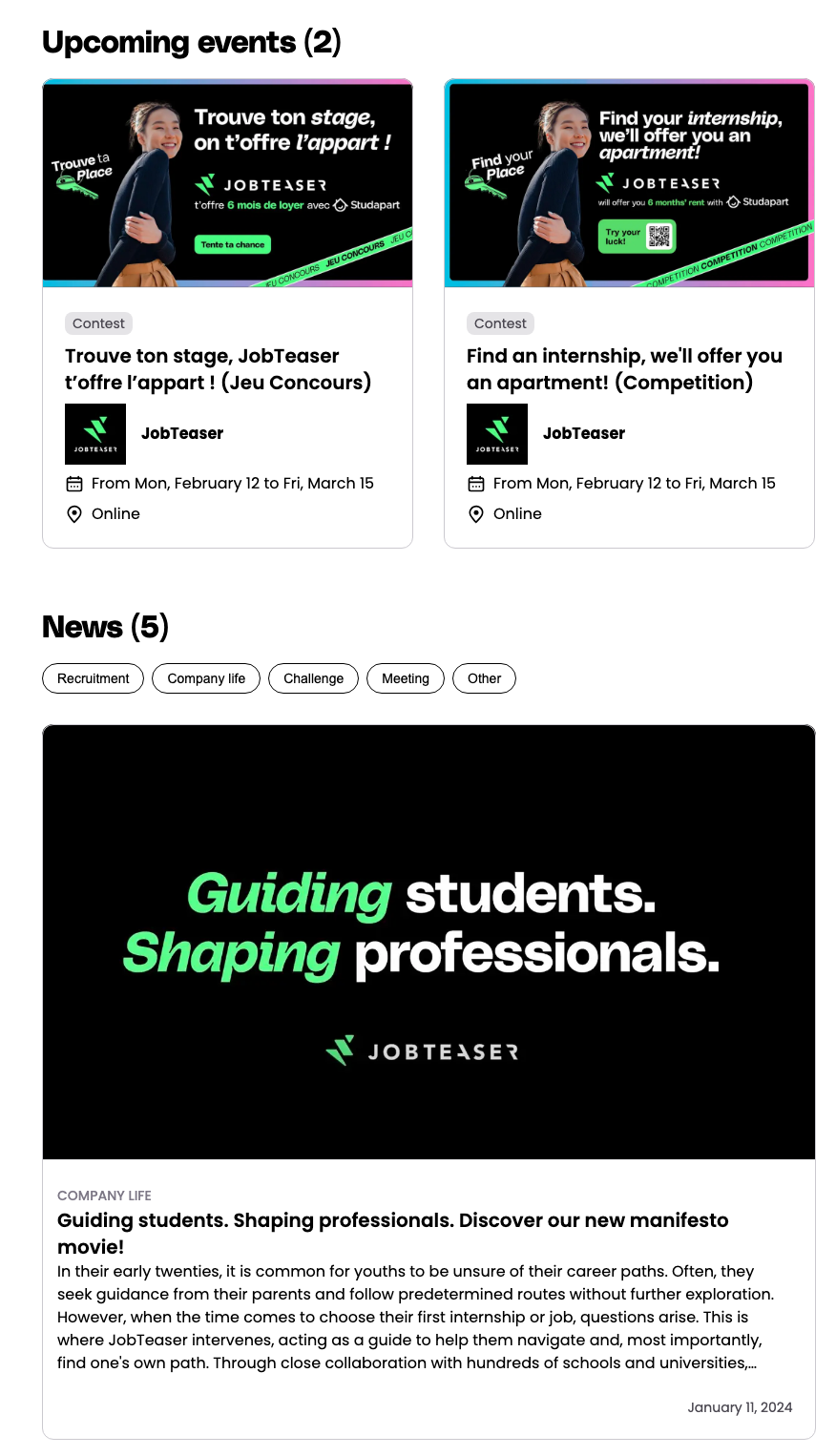 Your events (Push Coms, live videos in France,...) and your news (article section) are gathered in this tab that students mainly consult to get to know more about your company's latest news. Share with them what makes you stand out from the job market!