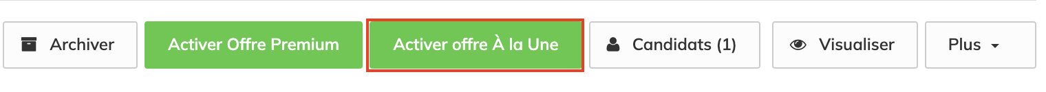Si vous ne voyez pas l'option "Activer votre Offre en Premium ou à la Une", c'est peut-être parce que ces types de crédit ne font pas partie de votre pack actuel. Si vous souhaitez discuter des options d'achat, veuillez contacter votre Account Manager.