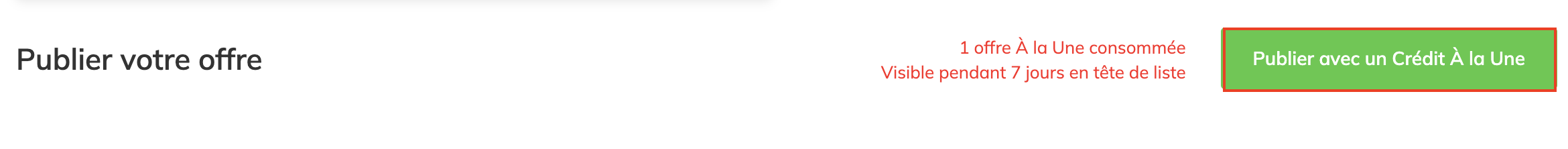 Sélectionnez l'offre en cours que vous souhaitez transformer en offre à la Une et cliquez sur « Publier avec un crédit à la Une ».