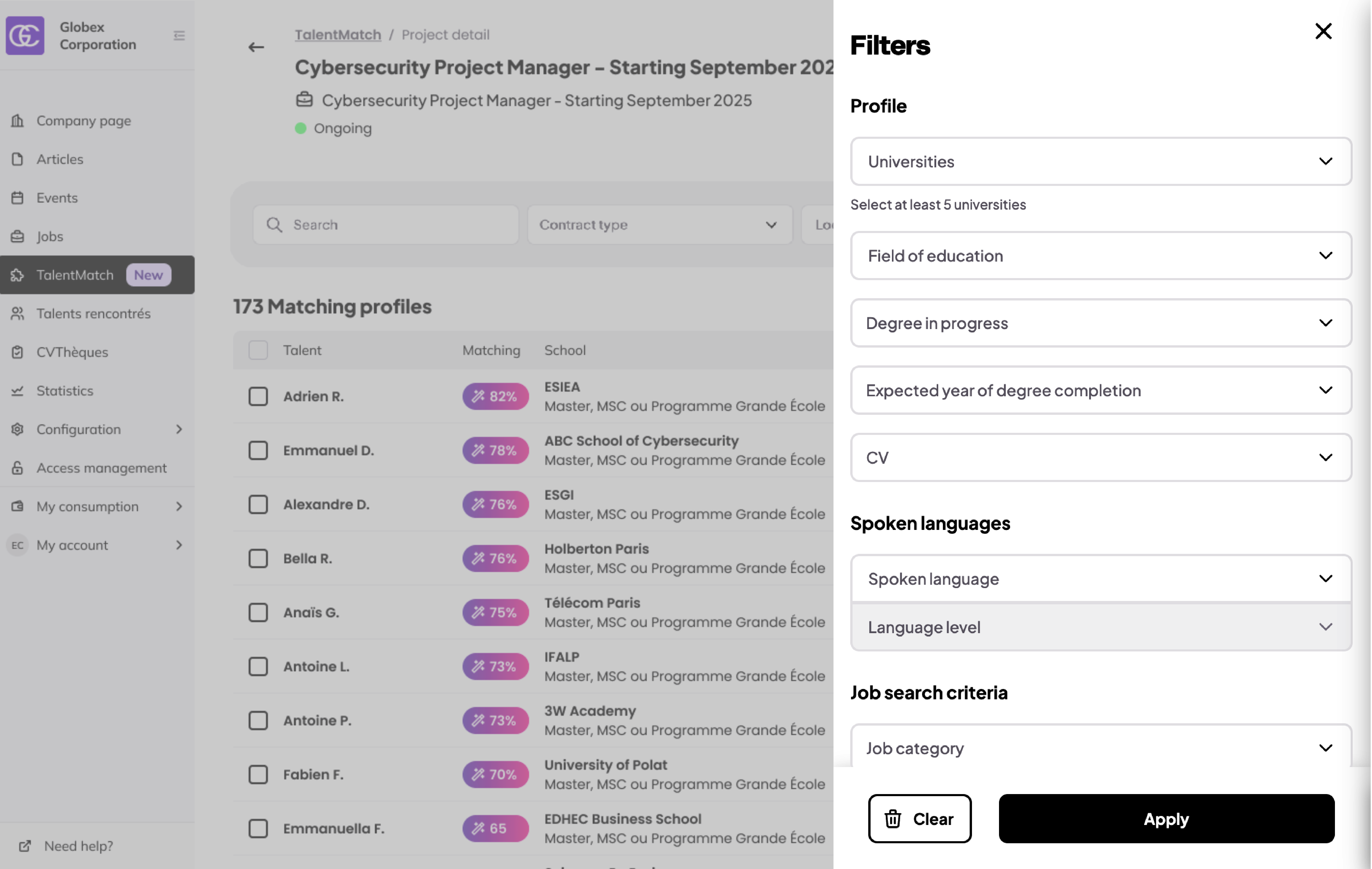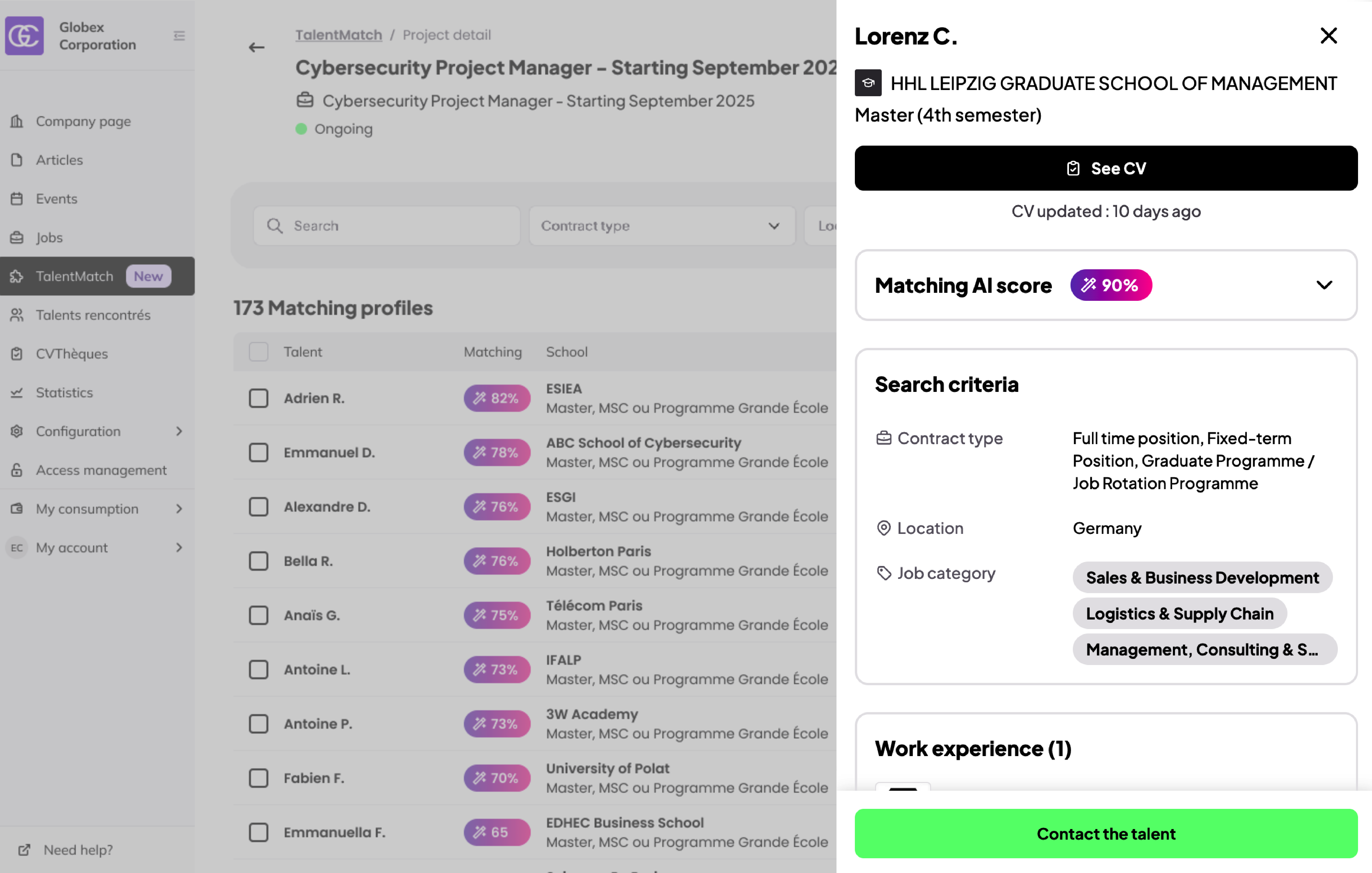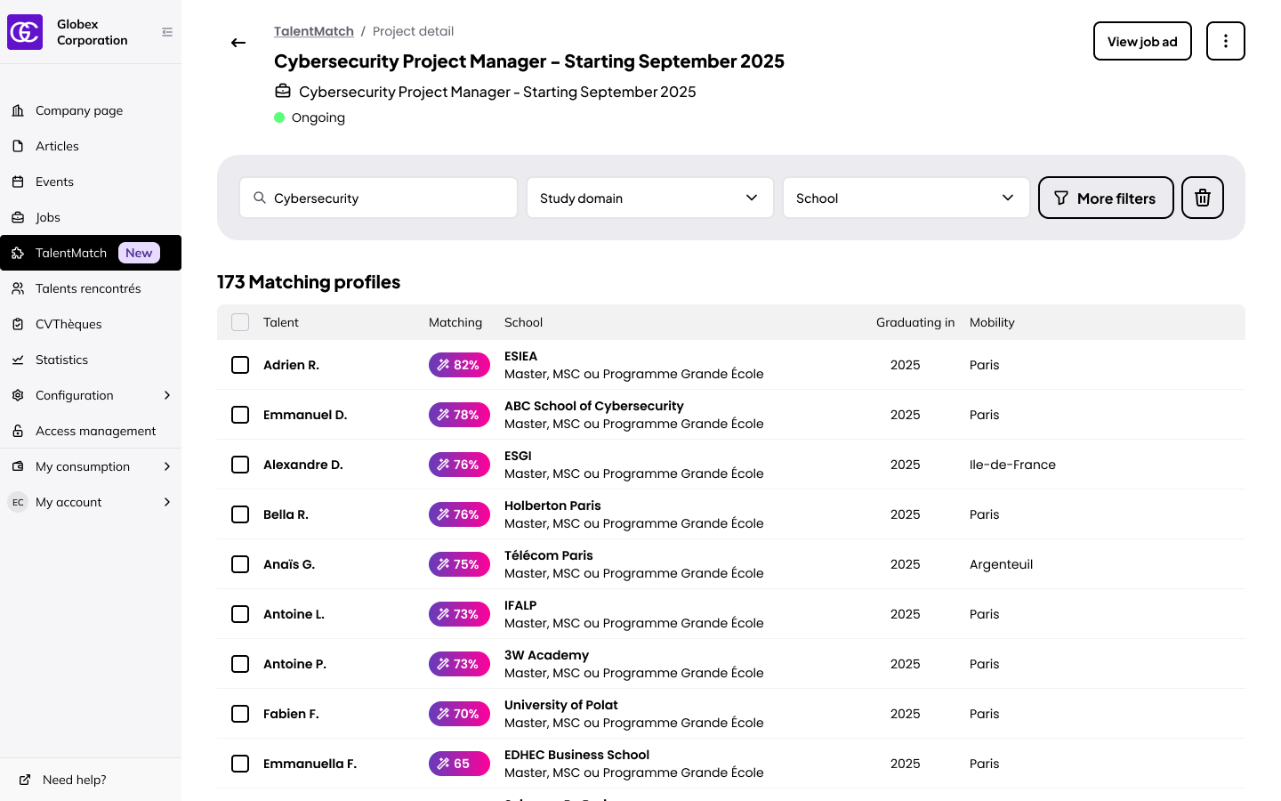 Chaque profil dispose d’un score de correspondance qui indique dans quelle mesure le profil de l’étudiant correspond à votre offre d’emploi. Vous pouvez également voir pourquoi un profil est recommandé, ce qui vous aide à comprendre rapidement ce qui rend ce candidat plus pertinent que les autres et à prioriser vos prises de contact en toute confiance.