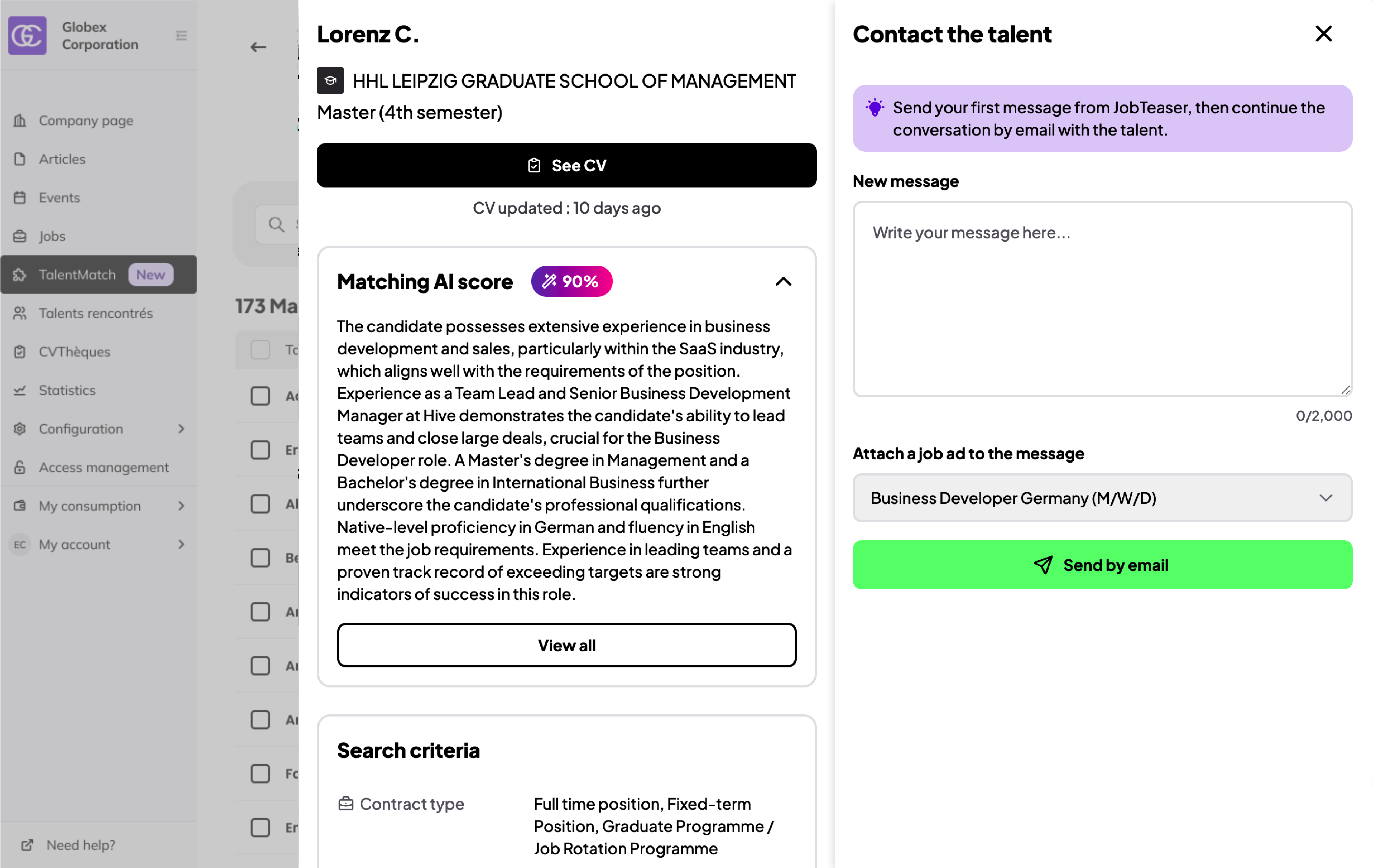 Une fois envoyé, le message sera reçu dans la boîte de réception des talents sélectionnés via une adresse email jobteaser.com. Votre propre adresse email ne sera pas partagée.