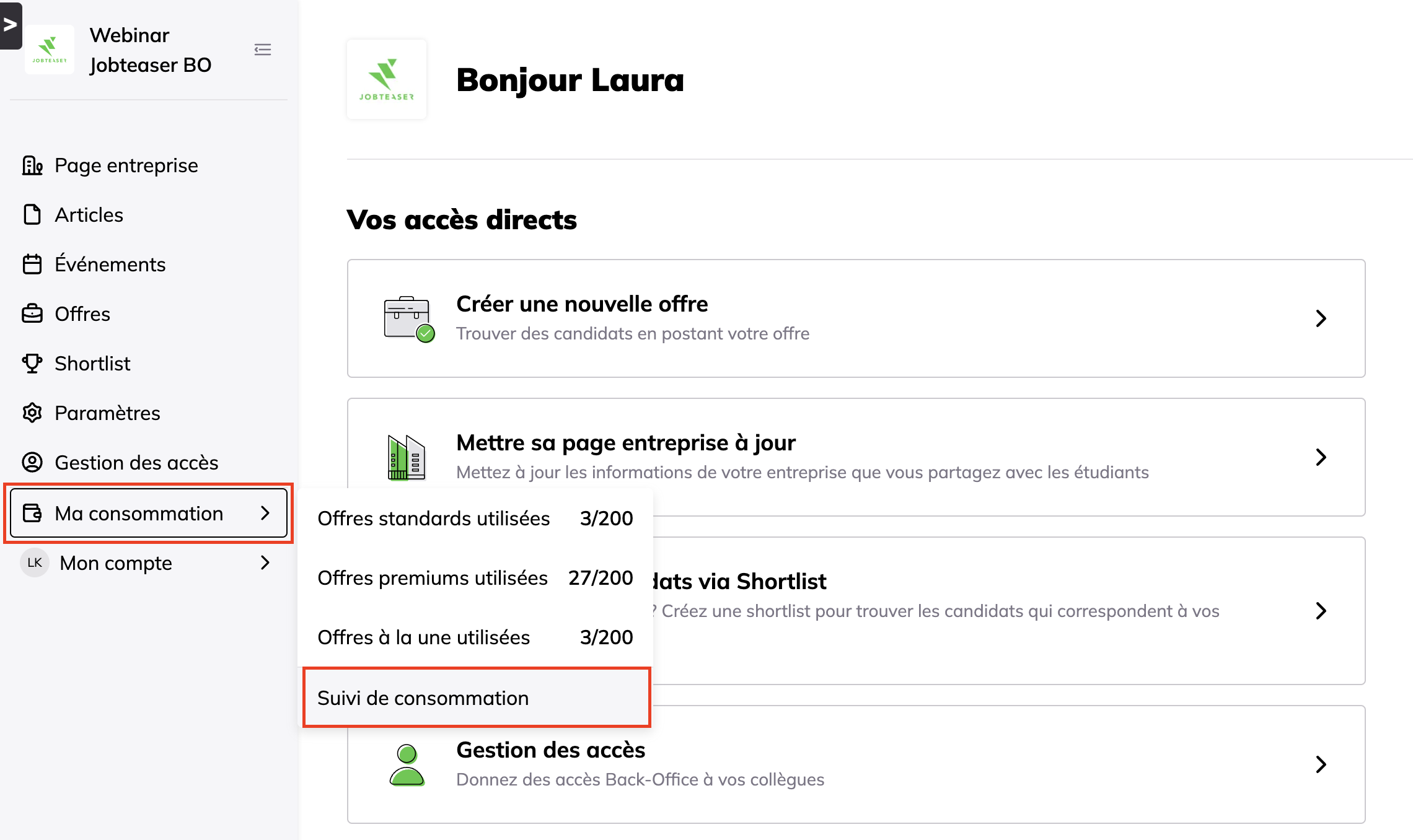 1. Allez sur l'onglet "Offres" de votre back-office puis cliquez sur "Suivi de l'utilisation".