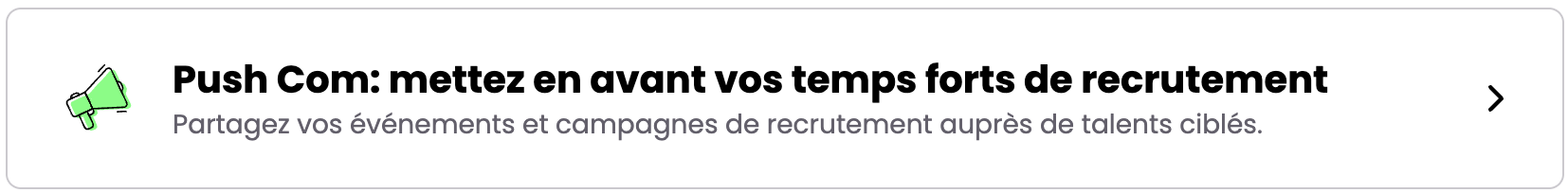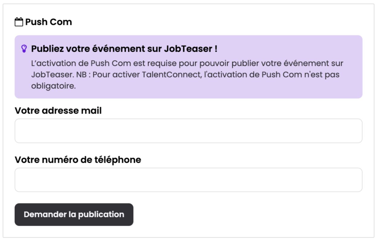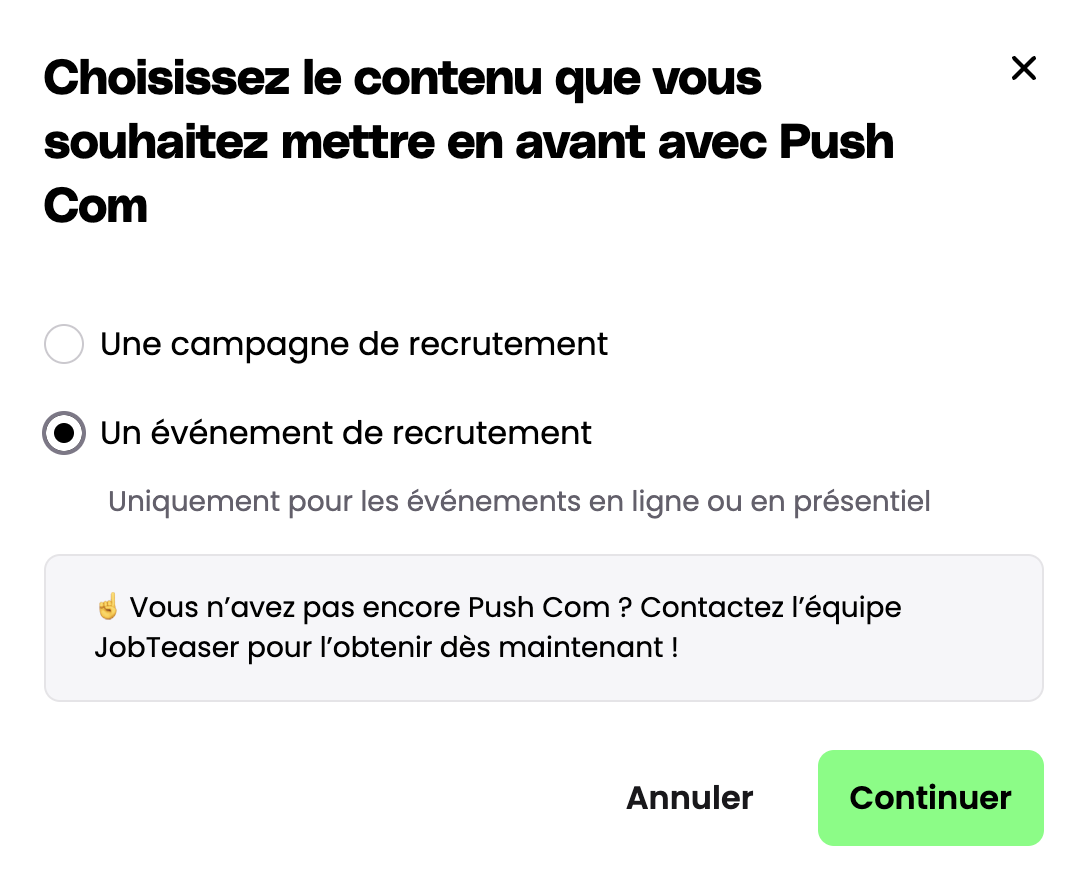 ✅ Notre équipe Customer Experience examinera votre Push Com pour s'assurer qu'il respecte les normes de JobTeaser et vous informera si des ajustements sont nécessaires. Une fois approuvé, votre Push Com sera mis en ligne pendant 30 jours ou jusqu'à la date de votre événement.