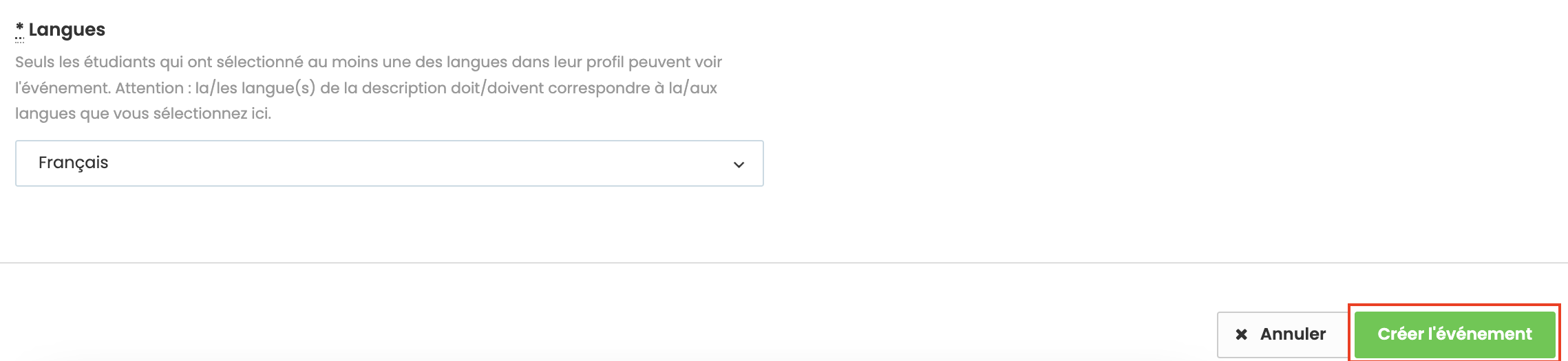 - Langues : Sélectionnez la langue de votre événement. Pour les événements bilingues, choisissez les deux langues et assurez-vous que la description est cohérente !