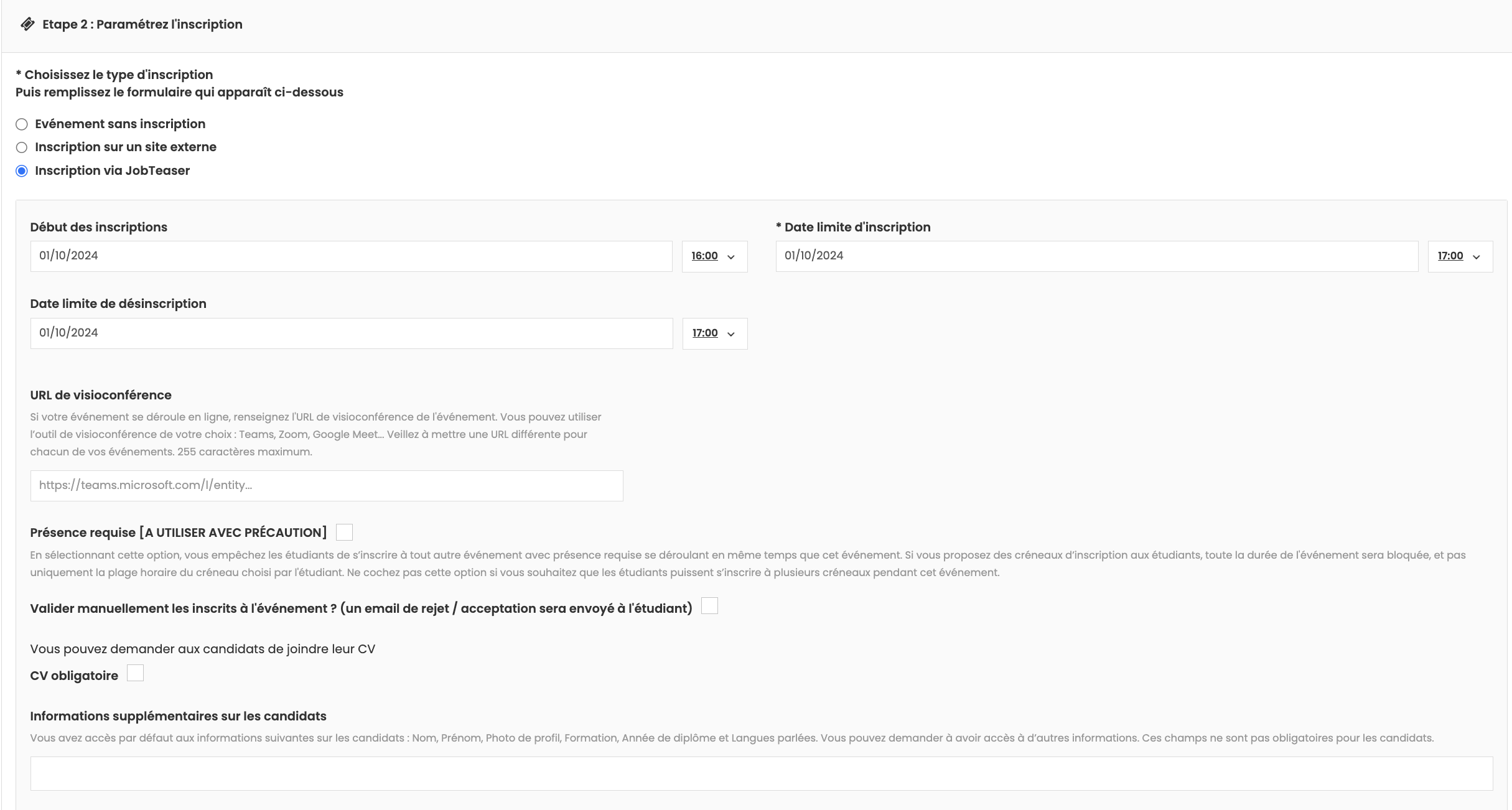 Inscription via JobTeaser : L'option la plus complète ! Gérez tout directement depuis votre back office. Commencez par entrer les dates d'inscription et le lien vers votre salle de réunion. Vous pouvez collecter des CV, poser des questions supplémentaires et même limiter le nombre de participants.