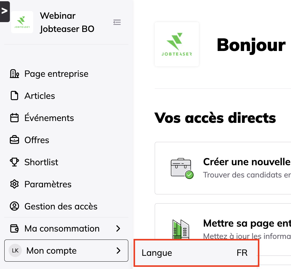 Si la langue que vous recherchez n'est pas disponible, veuillez contacter notre équipe Customer Care à l'adresse hello@jobteaser.com et demandez à ajouter une autre langue à votre back-office.